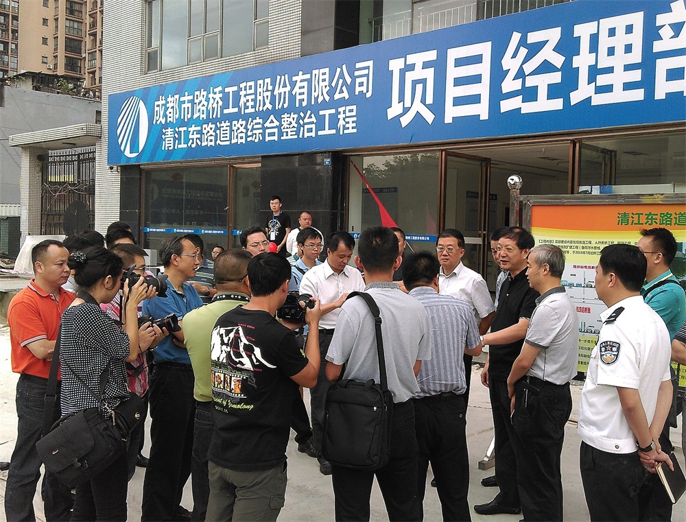 2015年8月20日,成都市人民政府資政黃平率安監(jiān)站、質(zhì)監(jiān)站負(fù)責(zé)人、青羊區(qū)區(qū)長及成都市各相關(guān)部門負(fù)責(zé)人等到公司清江東路道路綜合整治工程視察,公司董事長周維剛、董事兼常務(wù)副總經(jīng)理王繼偉、董事王建勇等陪同視察。